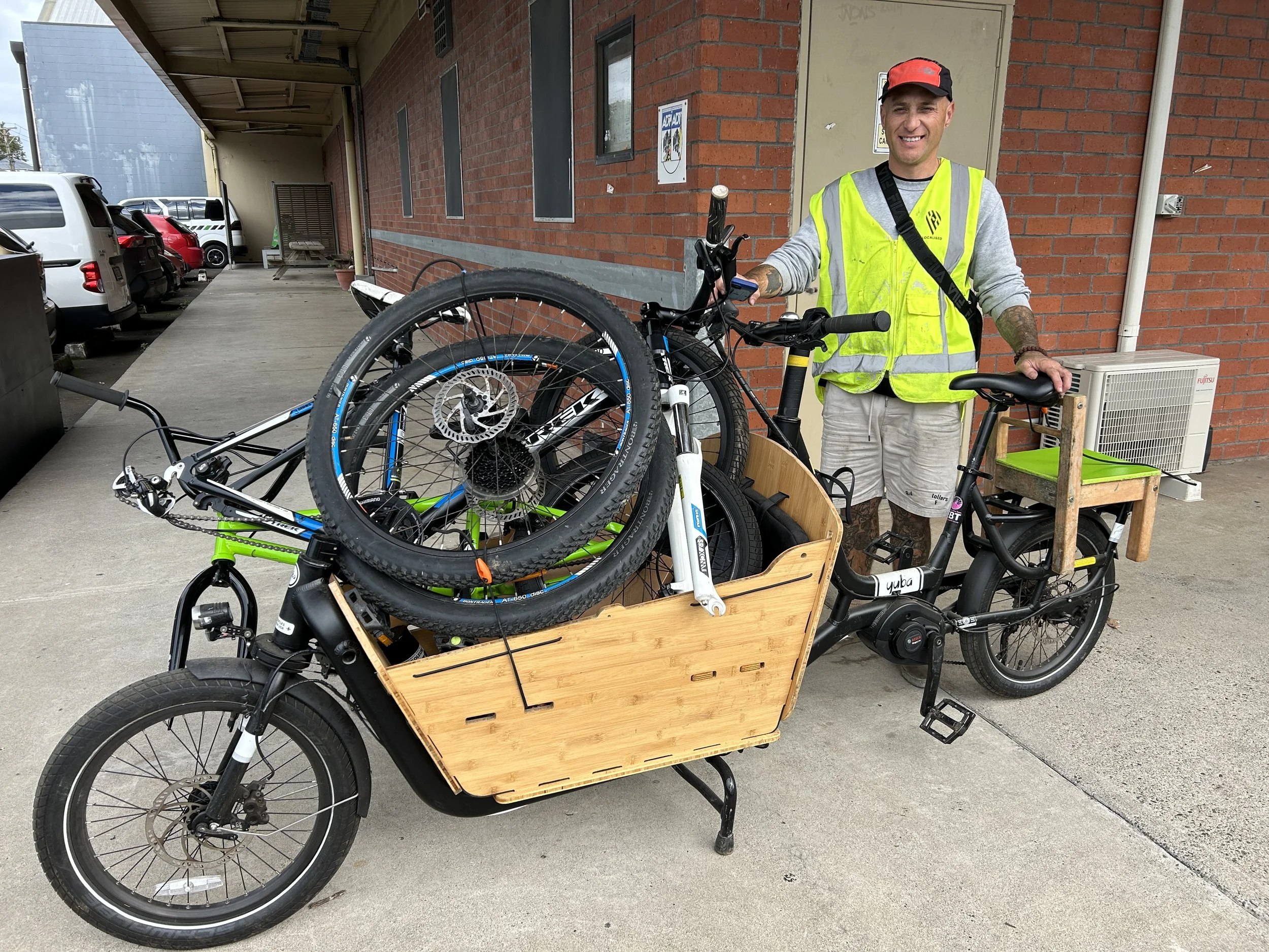 • A smiling man wearing a yellow safety vest and red cap standing beside a cargo bike with two additional bicycles loaded in the wooden compartment.