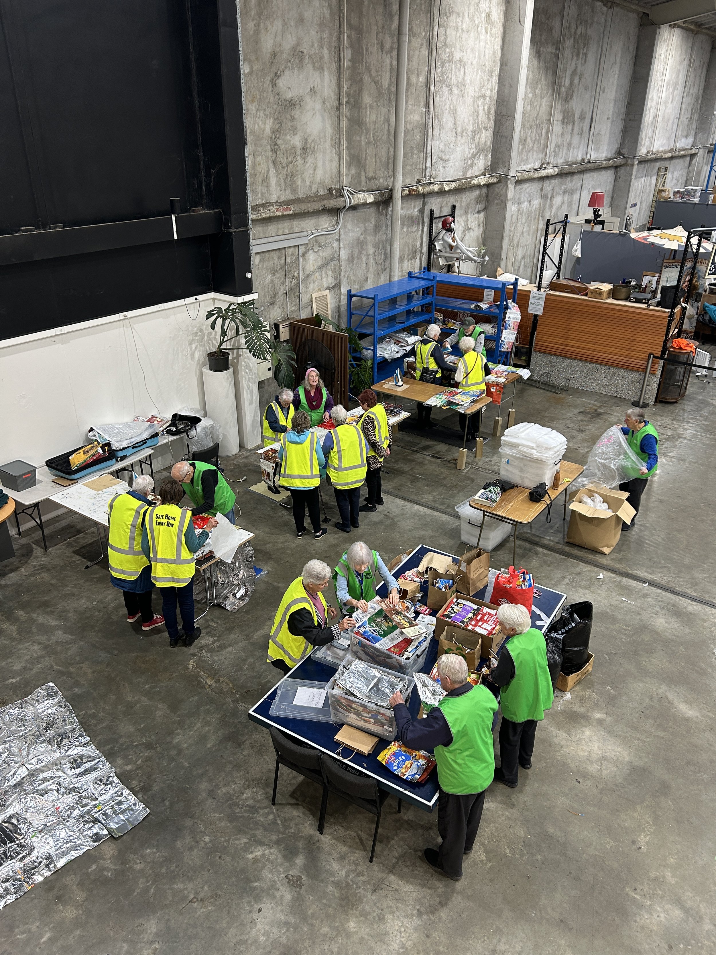 • Group of volunteers in a warehouse making thermal blankets out of chip packets, some wearing yellow safety vests, working at tables with food and supplies.